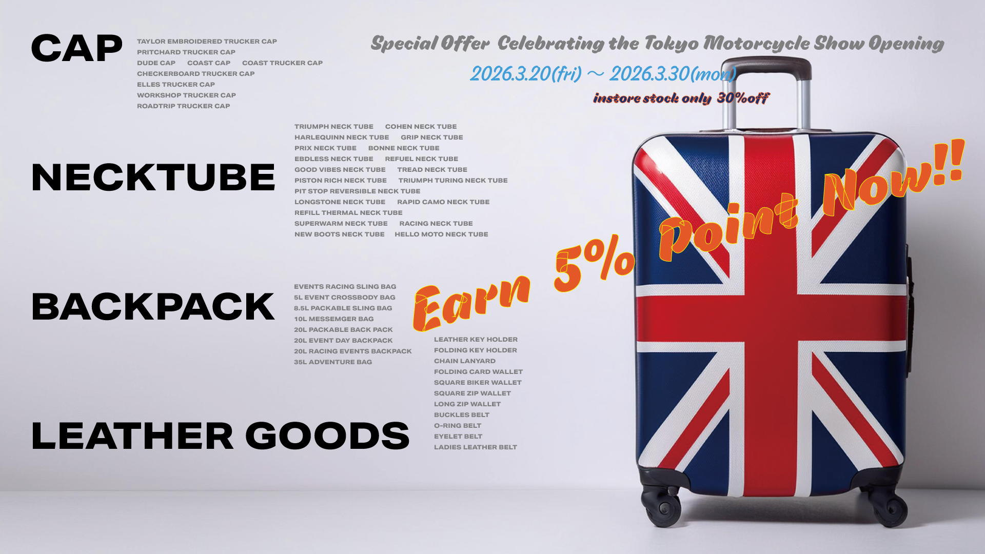 キャップ、ネックチューブ、レザーアイテムが30%OFF!!3月30日まで限定開催